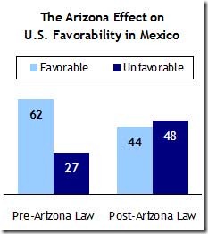È un elemento in più che testimonia un cambio di clima nella percezione degli Stati Uniti da parte dei messicani: dopo le leggi razziali dell’Arizona e nell’inanità di Obama a dar risposte ai migranti in un anno, i messicani che hanno un’immagine favorevole degli Stati Uniti sono crollati dal 69 al 44%.