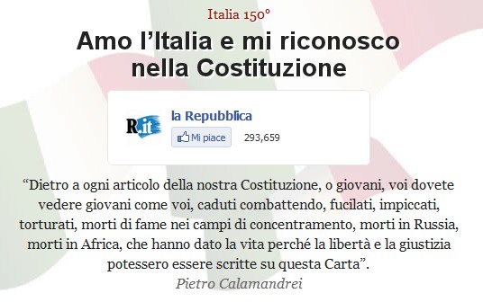 Squallida furbata di “La Repubblica” che usa la Costituzione, i 150 anni e perfino Piero Calamandrei per aumentare i suoi fan su Facebook.Infatti, sia in Home page che a questo link (al quale si riferisce l’immagine con tanto di citazione da Calamandrei) i lettori si ritrovano con una declaratoria inequivocabile: “amo l’Italia e mi riconosco nella Costituzione”. Logica conseguenza per chi ama l’Italia e si riconosce nella Costituzione è cliccare immediatamente sotto sul classico “mi piace” feisbuccaro oramai onnipresente in Rete.