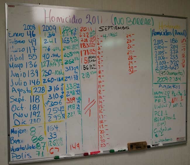 Proprio l’altro ieri qui a Ciudad Juárez (dove si concentrano quasi un terzo dei morti ammazzati della guerra di Calderón) ho avuto occasione di andare a rendere omaggio, nella redazione del Diario, al Choco, José Armando Rodríguez Carreón, ammazzato tre anni fa per aver fatto il suo dovere di giornalista. C’è ancora la sua scrivania, le sue foto, i fiori, la collega della scrivania a fianco continua a raccogliere e collezionare i bossoli delle pallottole ogni volta che va sulla scena di un delitto e alle spalle di quello che era il posto di lavoro del Choco (foto mia) i colleghi della redazione cronaca continuano ad aggiornare sulla stessa lavagna il numero dei morti ammazzati.