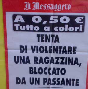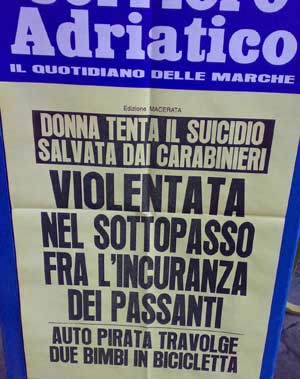 In genere mi guardo bene dallo sfogliare i quotidiani locali, ma le locandine, quelle te le schiaffano in faccia… Quelle nelle foto sono di oggi. Se prendo per buona quella del Corriere Adriatico, capisco che in un tranquillo capoluogo di provincia un tizio può stuprare una ragazzina tra l’indifferenza dei passanti. Ce li immaginiamo pure i passanti sbirciare lo stupratore e tirar via dritto.
