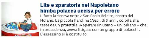 Del resto (si guardi l’aberrante testo nell’immagine tratta da Repubblica online) all’assassino italiano giravano le palle, era nervoso, aveva litigato con dei polacchi (gran rompipalle). E poi, grande esempio di civismo (individuato e braccato dalla polizia), nel corso della notte si è costituito. Del resto se muore una bimba straniera la notizia ha allarme sociale pari a zero, e chi è senza peccato scagli la prima pietra e chiunque osa fare commenti o speculare è un provocatore, sembra dire Repubblica (e tutti i giornali e telegiornali ben poco solidali con la piccola Karolina) che hanno già risolto il caso: uno sfortunato incidente.