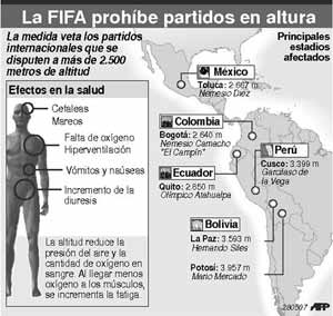 Il presidente della FIFA, Joseph Blatter, ha annunciato a Zurigo che le partite in altura, che si giocano da 100 anni, sono dal primo giugno proibite. Sono colpiti stadi internazionali di cinque paesi, Messico, Colombia, Ecuador, Perù e Bolivia ma soprattutto quelli di tre capitali, Quito, La Paz e Bogotá che da ora in avanti potranno veder giocare le loro nazionali, e i loro club impegnati in incontri internazionali, solo in televisione.
