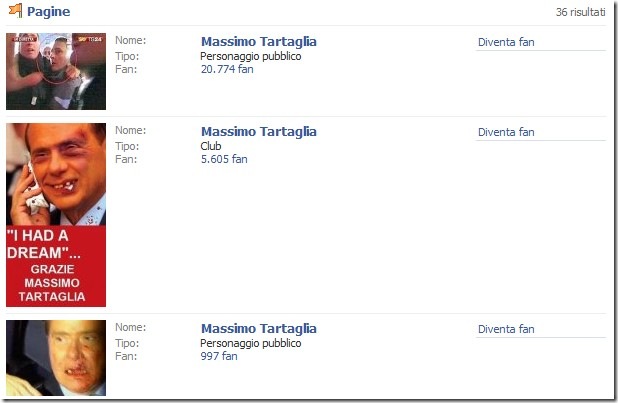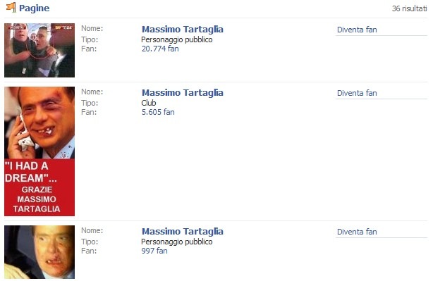 Massimo Tartaglia in Facebook. Snapshot delle ore 22.00