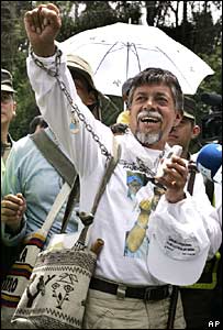 Gustavo Moncayo, maestro elementare colombiano e padre di un poliziotto da quasi dieci anni sequestrato dai guerriglieri delle FARC, è arrivato a piedi a Bogotà dopo un viaggio di 46 giorni e oltre 1.200 km, per esigere che si realizzi lo scambio umanitario di prigionieri tra governo e guerriglia. A sorpresa il presidente colombiano Alvaro Uribe ha tentato di cooptarlo ed a sorpresa il maestro ha replicato: “queste catene sono contro di lei, presidente Uribe, lei non è il padrone della vita di mio figlio“.