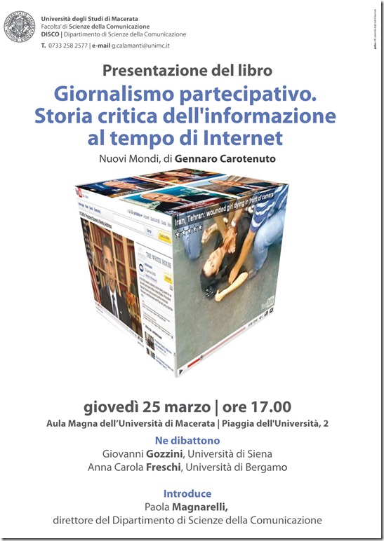 La presentazione di Giornalismo partecipativo. Storia critica dell’informazione al tempo di Internet, di Gennaro Carotenuto, si terrà oggi, giovedì 25 alle 17 presso l’aula magna dell’Università, piaggia della torre n. 2. Ne discuteranno Giovanni Gozzini, storico dell’Università di Siena e Anna Carola Freschi, sociologa dell’Università di Bergamo, introduce Paola Magnarelli.
