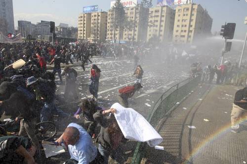 Le ultime notizie da Santiago parlano di 760 arresti e di una repressione durissima (nella foto la Plaza Italia). E’ questa la risposta del governo ‘socialista’ di Michelle Bachelet, alla grande manifestazione nazionale convocata dalla Central Unica de Trabajadores (CUT). La manifestazione è stata convocata esplicitamente contro il modello economico neoliberale, imposto con la dittatura di Augusto Pinochet, continuato in democrazia e lasciato intatto da Michelle Bachelet, una ex-esiliata politica e figlia di un ex-generale assassinato da Pinochet.