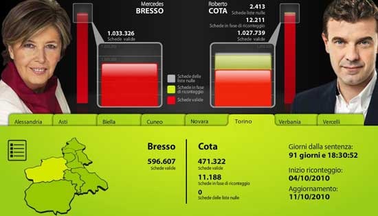PiemonteMercedes Bresso aveva vinto fin dall’inizio ed è stata derubata della vittoria nelle elezioni regionali in Piemonte, come il riesame del voto sta dimostrando. Ovviamente adesso diranno che con il riconteggio la sinistra vuole usurpare la volontà degli elettori. Che però era solo virtuale. Faglielo un po’ capire…