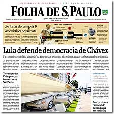 Folha071115 Dopo che a Santiago del Cile, nel corso del vertice iberoamericano, i presidenti di Argentina, Ecuador, Nicaragua e Bolivia oltre che il rappresentante cubano, Carlos Lage, avevano apertamente difeso il presidente venezuelano Hugo Chávez, attaccato violentemente dal re di Spagna e dal primo ministro Zapatero, indispettiti per le critiche generalizzate da parte dei governanti latinoamericani verso le multinazionali spagnole e verso l’ex capo del governo, José María Aznar, ora scende in campo anche il presidente brasiliano Luiz Inácio Lula da Silva in difesa del suo omologo venezuelano Chávez.