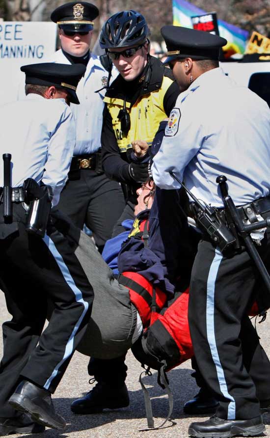 Più di cento pacifisti arrestati a Washington davanti alla Casa Bianca mentre manifestavano contro la guerra in Libia e ricordando l’ottavo anniversario dell’invasione dell’Iraq. I pacifisti europei e italiani o non sono pervenuti o blaterano di “male minore”.