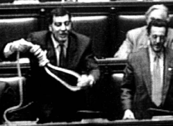 Il deputato leghista Luca Leoni Orsenigo mostra la forca in Parlamento nel 1993.