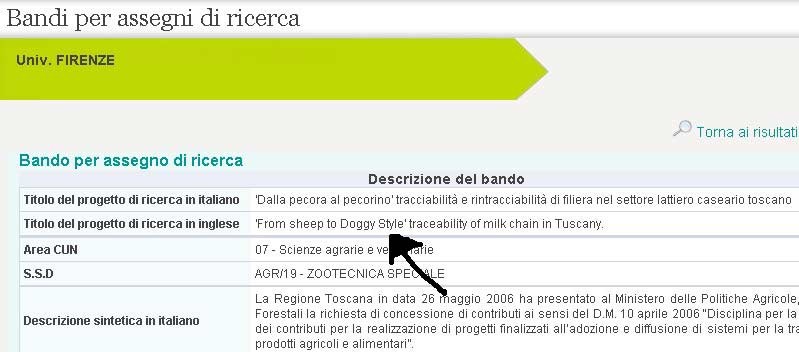 Di soldi ormai nell’università italiana ne restano pochini e quei pochi vanno rigorosamente spesi in un contesto di internazionalizzazione. Peccato che anche l’internazionalizzazione si debba saperla fare e forse è meglio affidarsi a dei bravi traduttori. Altrimenti si incorre in Caporetto come quella qui sopra dell’Università di Firenze che fa ricordare il tunnel dei neutrini di gelminiana memoria. Per un assegno di ricerca in zootecnia sulla tracciabilità del formaggio pecorino, un traduttore incapace, o forse computerizzato, ha trasformato il maschile in italiano del formaggio pecorino in un femminile che dall’italiano all’inglese indica né più né meno una delle più trite posizioni del kamasutra. Pietoso!
