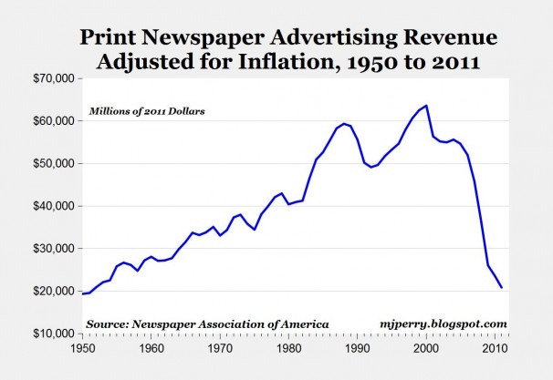 Esattamente cinque anni e un mese dopo la famosa intervista rilasciata dall’editore del New York Times Arthur Sulzberger al quotidiano israeliano Haaretz, che aveva predetto in 5 anni una prospera vita SOLO online per il suo quotidiano, il grafico della NSA dice fin troppo. Il modello economico dei giornali cartacei sta arrivando al capolinea della storia con una velocità perfino superiore a quella che prevedevamo solo tre o cinque anni fa.