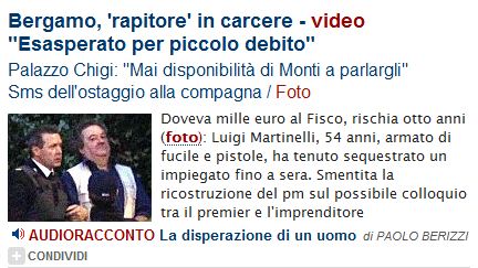 2) E’ stato immediatamente creato un contesto mediatico simpatetico verso Martinelli. Si guardi nell’immagine da Repubblica la parola ‘rapitore’ tra virgolette. Può sembrare pleonastico ma tra chi disperato si suicida e chi presunto disperato prende degli ostaggi ci sono differenze abissali. Personalmente esprimo simpatia e solidarietà ai dipendenti di Equitalia sequestrati.