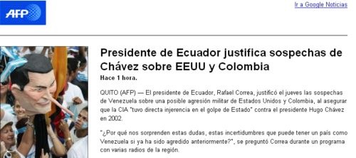 E invece no. Come viene accompagnata la notizia che "secondo Correa, Chávez ha ragione a temere Uribe" da parte della France-Presse? Con una foto ripresa da una manifestazione dell’opposizione ecuadoriana, che non ha nulla a che vedere con la notizia, nella quale si mostra un fantoccio con le fattezze di Correa e il naso da Pinocchio. Ovviamente la scelta dell’immagine non è né neutra né casuale e ribalta il senso della notizia e la percezione di questa da parte di un lettore normale: "Quel bugiardo di Correa dà ragione a Chávez contro Uribe. Di conseguenza deve avere ragione Uribe".