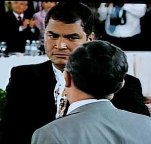 I media più corretti testimoniano del documento con il quale il presidente colombiano Uribe ha chiesto scusa per iscritto, mettendo nero su bianco l’ammissione di responsabilità per il massacro della scorsa settimana, sul quale emergono con lentezza dettagli sempre più crudi, e con il quale si è formalmente impegnato a non violare più il territorio dei paesi confinanti. La lunga passeggiata, il video è qui a fianco, con la quale Uribe cerca di uscire dall’isolamento profondendosi in baci e abbracci con i presenti, è un’invenzione di successo del presidente colombiano. Ma è comunque il documento il fatto sostanziale. Un documento che offre le scuse colombiane per un’azione bellica che appena poche ore prima era stata energicamente difesa dal governo statunitense di George Bush, che è il vero (anche se temporaneo) sconfitto del chiarimento di Santo Domingo che sul breve periodo alleggerisce la situazione, e ci induce ad alcune considerazioni.
