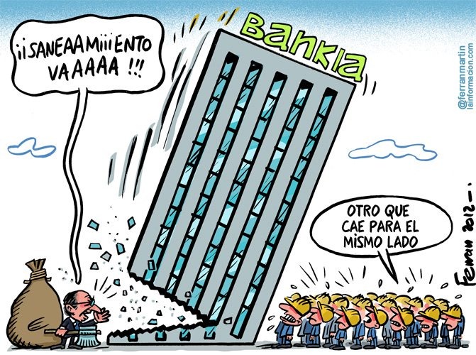 Ormai è fatta. Il governo di Mariano Rajoy (Partito Popolare, destra) inietterà un oceano di 20 miliardi di € di soldi pubblici nelle vene di Bankia, il moribondo gigante bancario della bolla immobiliare spagnola. Anche lì la scusa è “too big too fail”. Una montagna di soldi bruciati sull’altare di una speculazione che con poche regole chiare (ma viste come la peste dal pensiero unico che sta affamando l’occidente dopo aver distrutto il sud del mondo) potrebbe essere marginalizzata.