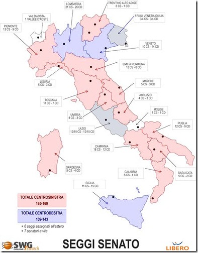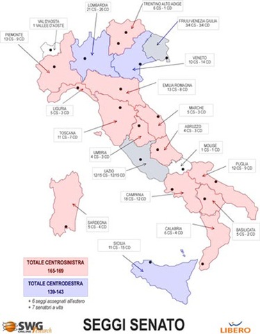 I problemi, come tutti sanno, sono al Senato. E qui la rottura delle coalizioni li ha complicati moltissimo. In particolare ci sono due problemi. Il primo è che il premio viene attribuito alla prima forza di OGNI regione. Il secondo è dato dal fatto che SA e UDC, entrambe date nei sondaggi nazionali appena al di sotto del quorum dell’8% (buono per il Senato) riusciranno a starvi sopra in alcune regioni e saranno fuori in altre. Quindi per capirci, ci saranno regioni dove la minoranza dei seggi sarà attribuita ad una sola forza, in altre a due, in altre ancora a tre. Un caos.