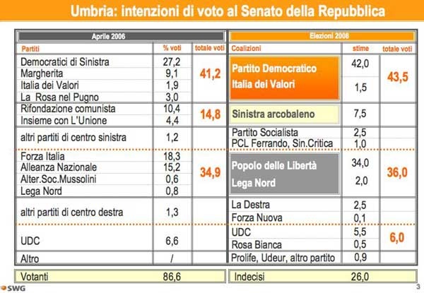 L’Umbria è una regione piccola attribuendo SOLO sette senatori. Ma spiega perfettamente quanto avevamo studiato nell’articolo più ampio al quale rimando. La cosa è semplicissima e non fa venire l’emicrania. Il PD è quasi sicuro di arrivare primo al Senato avendo un vantaggio di 7.5 punti sul PDL ma purtroppo la SA manca il quorum per appena lo 0.5%. Se così finisse, per il premio di maggioranza il PD prenderà QUATTRO senatori, mentre TRE andranno al PDL e ZERO alla SA.