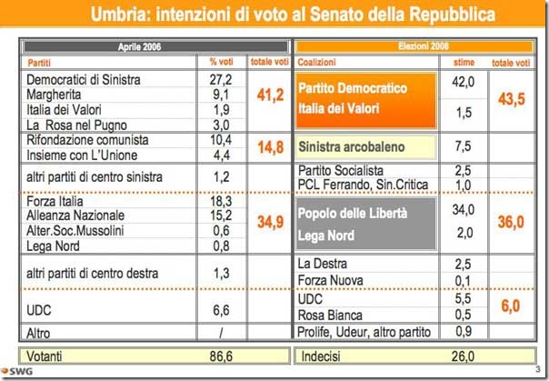Quello nell’immagine qui sotto è un sondaggio della SWG pubblicato ieri e si riferisce alle intenzioni di voto per la regione Umbria. Se non ci sei già entra poi nell’articolo per una riflessione collegata all’articolo L’arte di votare al tempo del Porcellum.