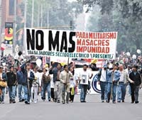 La denuncia di Iván Cepeda, dirigente nazionale del Movimento delle Vittime del Terrorismo di Stato è precisa: “E’ una rappresaglia per aver portato in piazza i crimini che hanno commesso nella totale impunità i paramilitari negli ultimi 20 anni”. Già il giorno prima della marcia Carmen Carvajal, un maestra dei dintorni di Santander, è stata assassinata con tre colpi alla testa da due incappucciati. Il giorno della marcia è toccato ad un dirigente del sindacato dei bancari di Bogotà. Leónidas Gómez è stato sequestrato da un gruppo di paramilitari e il suo cadavere è apparso due giorni dopo mentre a Medellín altri paramilitari assassinavano Gildardo Gómez, come Carmen maestro e sindacalista e organizzatore della manifestazione. La quarta vittima è Carlos Burbano, anche lui sindacalista, ma soprattutto instancabile nel denunciare il terrorismo di Stato a San Vicente de Caguán. Lo hanno torturato orribilmente e hanno lasciato il suo corpo in una discarica. A loro si aggiungono due consiglieri comunali ammazzati nelle ultime 72 ore: David Padilla, che aveva appena 18 anni, e Elser María Endo.
