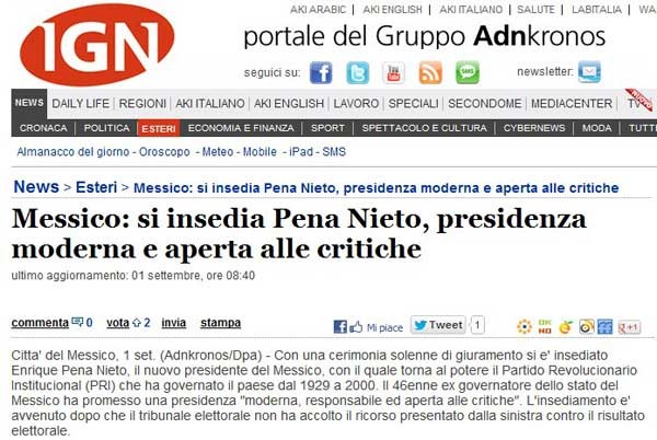 Sarei felicissimo di vedere anche una solo foto della solenne (ma segretissima) cerimonia di giuramento che Adnkronos, una delle più importanti agenzie di stampa italiane, spaccia come avvenuta ieri a Città del Messico. In realtà Peña Nieto, non “Pena Nieto”, ha visto solo confermare il risultato elettorale dalla giunta delle elezioni (che il candidato di centro-sinistra López Obrador non ha riconosciuto, ma è altro affare) e c’è stata, una semplice telefonata di congratulazioni da parte del presidente uscente Felipe Calderón. Adnkronos si è portata avanti col lavoro ma il passaggio di potere avverrà solo il primo dicembre. Fino a quando in Italia sopporteremo un’informazione così sciatta?