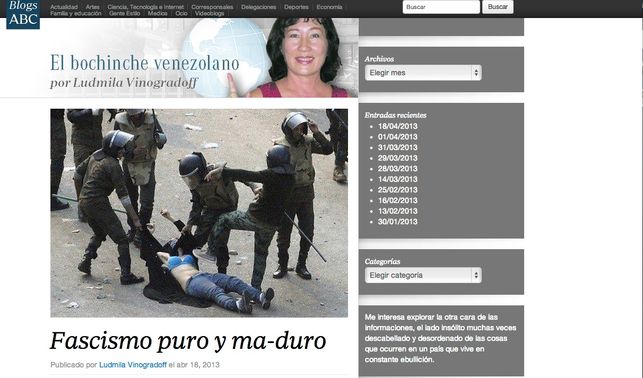 Il quadro generale lo lasciamo ad altra occasione, ma questa perla disinformativa sul Venezuela merita. Dove avete già visto questa foto? Risposta banale. È la foto più famosa delle repressioni egiziane di Piazza Tahrir. Eppure Ludmila Vinogradoff, famigerata corrispondente da Caracas del quotidiano spagnolo di destra ABC dopo esserlo stato per El País (per il quale aveva appoggiato con trasporto il golpe dell’11 aprile 2002), la spaccia per una foto della millantata repressione operata contro l’opposizione venezuelana. Lo fa con tanto di gioco di parole sul nome di Nicolás Maduro al quale dà del fascista, sfuggendole che per un giornale che ha appoggiato tutti i crimini del franchismo dar del fascista a qualcuno è quasi un complimento. L’articolo è rimasto online per poche ore e poi è stato ritirato. Poco più di un mese fa lo stesso ABC aveva inventato di sana pianta la storia della bara vuota di Hugo Chávez, ripresa senza alcuna verifica dalla nostra stampa e ainda mais…