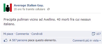 Di sicuro lo hanno trovato divertente almeno 567 carogne che hanno cliccato su “like” per questo esempio fulgido di razzismo territoriale. 567 carogne sono meno dell’1% delle 65.862 carogne alle quali piace questa pagina tenuta da infami per infami. 65.862 carogne che cliccano mi piace su di una pagina apologetica del fascismo e delle leggi razziali del 1938. L’ho segnalata a Facebook. Se ci fosse qualche avvocato che avesse voglia di portare in tribunale questa gentaglia…