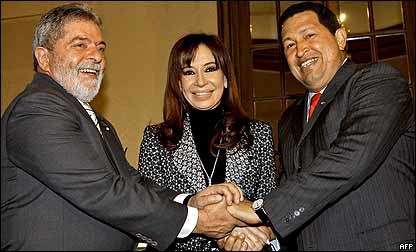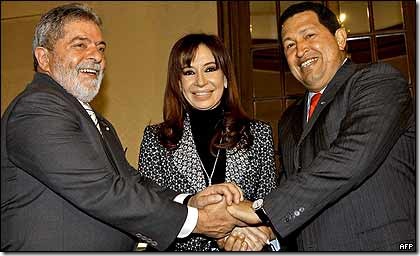 A Buenos Aires si sono riuniti ieri il presidente brasiliano, Lula da Silva, quello venezuelano Hugo Chávez, ospiti di Cristina Fernández. Sono i tre paesi più importanti e il motore dell’integrazione latinoamericana che tanti nemici incontra in Europa e Nordamerica ma vanno ogni volta più avanti. E’ quello che negli Stati Uniti hanno definito “asse del male latinoamericano” e Cristina con Chávez sono oggi in Bolivia per appoggiare Evo Morales per il revocatorio del prossimo 10 agosto.
