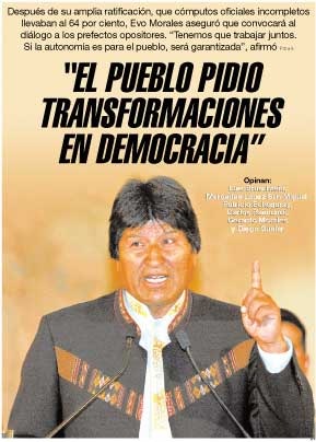 Eppure lui, Evo Morales, il presidente indigeno della Bolivia, ha aumentato di quasi mezzo milione i voti presi nel 2005, passando da un già straordinario 54% a un plebiscitario 64% di consensi e crescendo in tutte le regioni del paese comprese quelle governate dall’opposizione (a Beni dal 16% al 43%, a Santa Cruz dal 33% al 39%, a Tarija dal 31% al 47% e a Pando dal 20% al 49%).