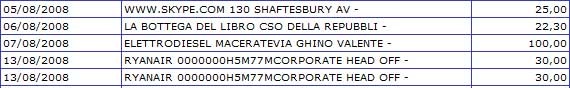 Quello nell’immagine è un frammento dell’estratto conto della mia carta di credito. La parte interessante è il doppio addebito da 30 Euro effettuato dalla compagnia aerea Ryanair. Semplicemente: un solo pagamento da 30 Euro mi è stato estorto due volte. E’ l’ultima angheria, ma trattasi di vero e proprio furto, e avrei perfino un testimone per dimostrarlo.