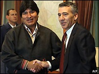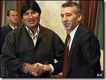 “Non abbiamo paura di nessuno –ha dichiarato Evo nel Palazzo del Governo a La Paz- non abbiamo paura neanche dell’impero. Denuncio che l’ambasciatore statunitense Philip Goldberg (nella foto con il presidente) è responsabile di cospirare contro la democrazia e per dividere la Bolivia e pertanto lo dichiaro persona non grata”.