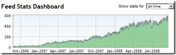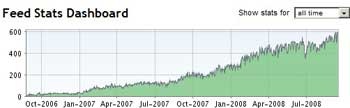 Un quasi raddoppio del quale non posso non essere felice e ringraziare tutti. A questi vanno aggiunti i 2100 iscritti alla newsletter (l’unico numero in crescita ma lenta) e gli oramai 600 lettori quotidiani via feed RSS (nel grafico la crescita in due anni di uso di Feedburner). L’articolo più letto è stato quello sul fallimento della Lehman Brothers. Tra i siti dai quali sono venute più visite, al primo posto c’è Orizzonte Scuola, gli aggregatori Wikio e Liquida, il blog del Nono Ciclo della SSIS, al quale va tutta la mia solidarietà, il sito di Gianni Minà e l’indispensabile Annalisa Melandri. I siti ai quali ho mandato più visite sono quello di Giancarlo Siani, Gianni Minà e Mauro Biani.