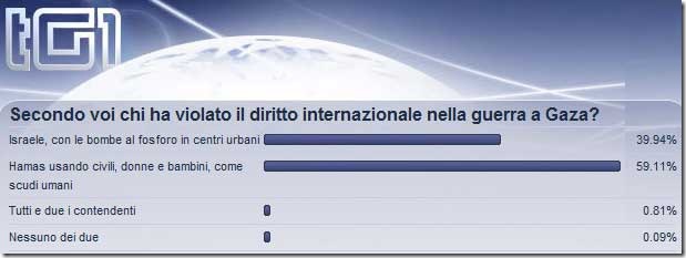 L’immagine mostra un sondaggio del TG1 su Gaza. Solito disclaimer sul fatto che non ha valore scientifico (e nemmeno si sa quanti hanno votato) ma stupore che, nonostante Claudio Pagliara, ben 4 su 10 pensino che la colpa sia d’Israele. Ancor di più però è interessante che appena lo 0.8% attribuisce responsabilità ad entrambi i contendenti. E’ solo un votante ogni 125 ed è difficile pensare a conflitti che creino più polarizzazione ma è anche sorprendente che così pochi votanti non esprimano una posizione netta: o di qua o di là.