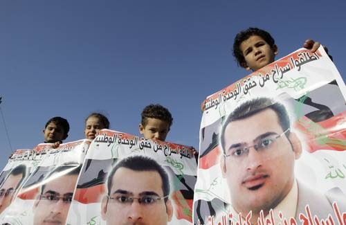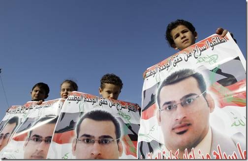 Manifestazione per la liberazione di Muntazer al-Zaidi, il giornalista condannato a tre anni per la scarpata a George Bush. E’ questa la vostra esportazione della democrazia?