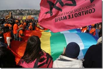 I colori.Un corteo gioioso e festoso. I ragazzi delle scuole medie campane si vestono da clown, quelli di Lucca hanno il volto coperto da fazzoletti bianchi, perché “vogliamo guardare con altri occhi”. Dietro uno striscione giallo ci sono gli africani del Movimento dei migranti e rifugiati di Caserta, che marciano “Contro la camorra e il razzismo”. Magliette bianche con un codice a barre e un uomo con il cappio al collo ricordano che “La mafia ha un prezzo”. “Vivo in mezzo alla mondezza, la vogliamo spazzare sta camorra o no?” dice ridendo Ugo, un bambino di Scampia. Gli studenti dell’Uds e dell’Udu cantano e ricordano che l’antifascismo è un valore. Dal camioncino parte un pezzo storico dei 99 Posse, “il sole splende forte a piazza Plebiscito”.