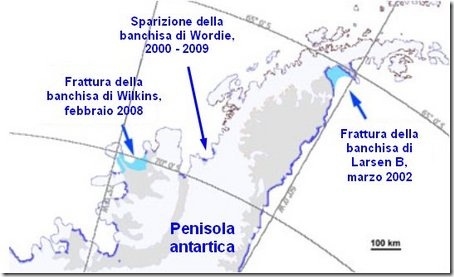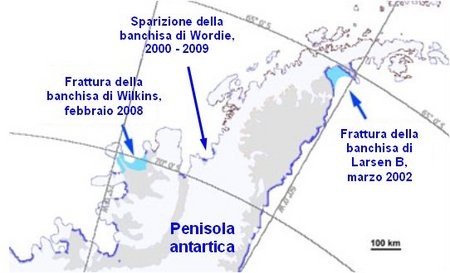 Le foto dal satellite testimoniano che la piattaforma di Wilkins, un’enorme distesa di ghiaccio di 14.000 chilometri quadrati (più della ragione Campania), è collassata e va alla deriva proprio sotto la Terra del Fuoco, il territorio più meridionale dell’America e del mondo, dove però si prevede che non arriverà mai sciogliendosi molto prima a causa del riscaldamento climatico.