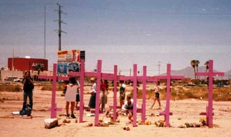 Tra il 6 e il 7 novembre 2001 furono ritrovati 8 corpi di giovani donne con evidenti segni di tortura e violenze sessuali, alcuni dei quali in decomposizione. Le ragazze erano state probabilmente uccise in diversi momenti, durante i 6 mesi precedenti. Alcuni dei corpi sembravano essere stati tenuti in una cella frigorifera, per poi essere “seminati” in quel campo di cotone che si trova proprio di fronte a uno dei simboli della città: l’associazione delle maquiladoras (l’AMAC che si intravede nella foto), le fabbriche di assemblaggio che dagli anni ’70 hanno invaso la frontiera con gli Stati Uniti impiegando mano d’opera, nei primi anni soprattutto femminile, a basso costo.