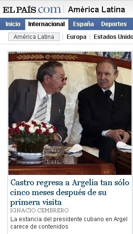 Il fatto più grazioso è che è lo stesso quotidiano madrileno ad essere cosciente di non avere cosa dire. Il titolo di apertura (nell’immagine) è infatti sul viaggio di stato di Raúl Castro in Algeria. Nonostante vi aprano fin dalla titolazione (e poi in tutto il pezzo) si preoccupano di farci sapere che il viaggio è carente di contenuti e che quindi quello sfaccendato di Raúl Castro non aveva altro da fare che bighellonare per Algeri tre giorni. Se questa è una notizia…
