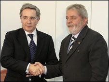 Il presidente colombiano Álvaro Uribe (con Lula nella foto) sta realizzando un viaggio lampo in tutto il continente per giustificare la concessione del proprio governo di sette basi statunitensi che rappresentano un fucile puntato contro tutto il Continente ma soprattutto contro la leadership brasiliana. A parte l’appoggio (misurato a onor del vero) del peruviano Alan García ha finora ottenuto solo la neutralità di Fernando Lugo e il dissenso, preoccupazione, rifiuto di tutti gli altri.