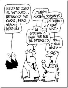 “Gli Stati Uniti sono come il Vaticano, riconoscono le loro colpe ma molto tempo dopo” ”Ammettiamo che Carlos Menem riceveva tangenti” “Ma veramente? e che altro?” ”L’invasione dell’Iraq fu per il petrolio” ”Nooooo! E che altro?”