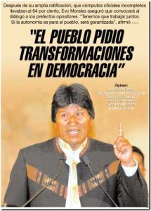 In Bolivia si sta giocando la partita più difficile. Mentre il governo di Evo Morales convoca al referendum sulla nuova Costituzione per il prossimo quattro di maggio, i sei dipartimenti in mano all’opposizione non lo riconoscono più come presidente.
